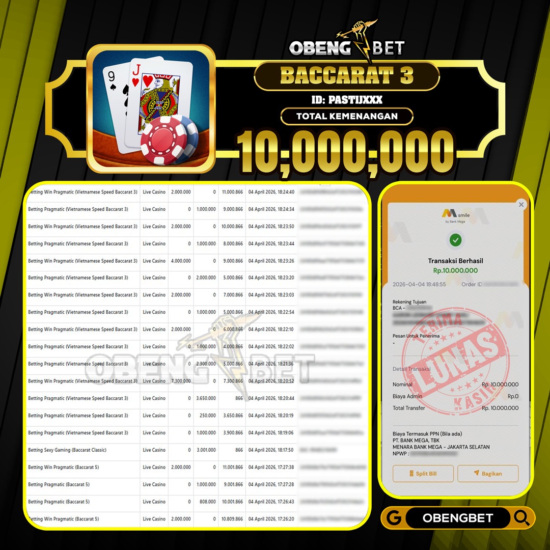 Bukti Kemenangan Member OBENGBET Live Casino 04 April 2026 – Situs kami merupakan salah satu situs bandar online terbesar dan terpercaya yang akan selalu membayar berapapun kemenangan pemain di obeng bet. Jika anda belum sempat bermain di situs obengbet kami sangat merekomendasikan link situs ini untuk di jadikan wadah tempat bermain game judi online terbesar dan terpercaya dengan berbagai permain yang sangat populer seperti togel online, slot online, live casino, sportbook, sabung ayam dan banyak permainan lainnya yang sudah di sediakan situs obengbet,