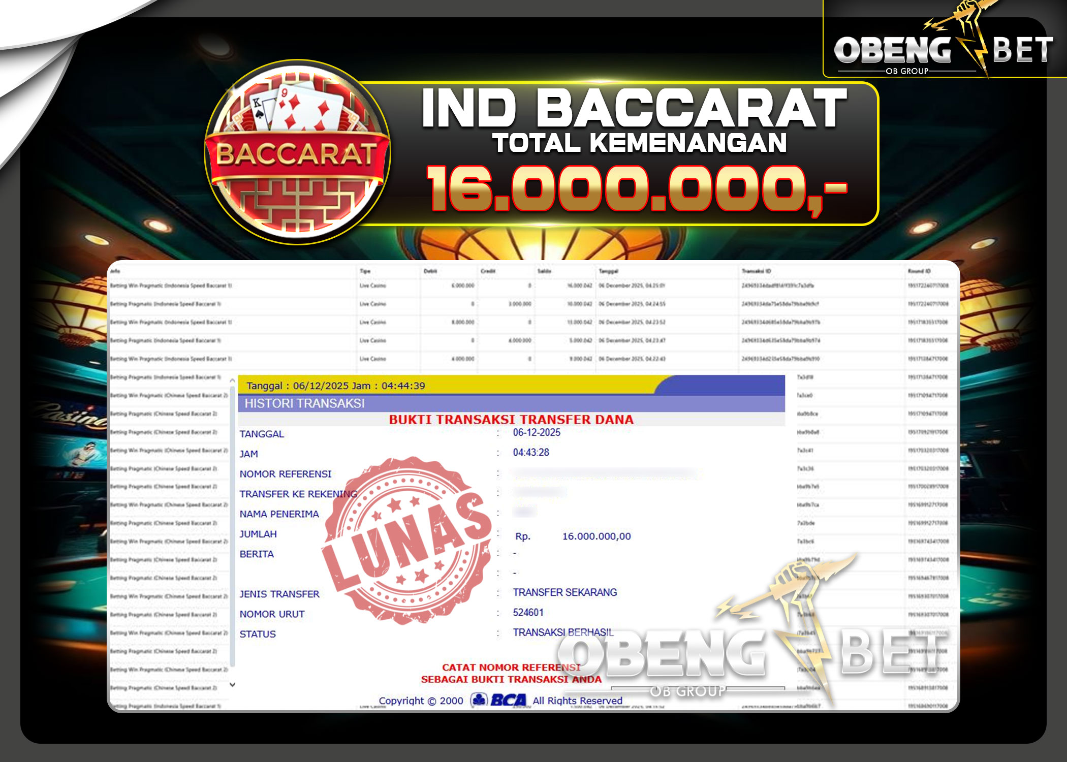 Bukti Kemenangan Member OBENGBET Live Casino 06 Dec 2025 – Situs kami merupakan salah satu situs bandar online terbesar dan terpercaya yang akan selalu membayar berapapun kemenangan pemain di obeng bet. Jika anda belum sempat bermain di situs obengbet kami sangat merekomendasikan link situs ini untuk di jadikan wadah tempat bermain game judi online terbesar dan terpercaya dengan berbagai permain yang sangat populer seperti togel online, slot online, live casino, sportbook, sabung ayam dan banyak permainan lainnya yang sudah di sediakan situs obengbet,