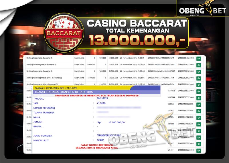 Bukti Kemenangan Member OBENGBET Live Casino 20 Nov 2025 – Situs kami merupakan salah satu situs bandar online terbesar dan terpercaya yang akan selalu membayar berapapun kemenangan pemain di obeng bet. Jika anda belum sempat bermain di situs obengbet kami sangat merekomendasikan link situs ini untuk di jadikan wadah tempat bermain game judi online terbesar dan terpercaya dengan berbagai permain yang sangat populer seperti togel online, slot online, live casino, sportbook, sabung ayam dan banyak permainan lainnya yang sudah di sediakan situs obengbet,