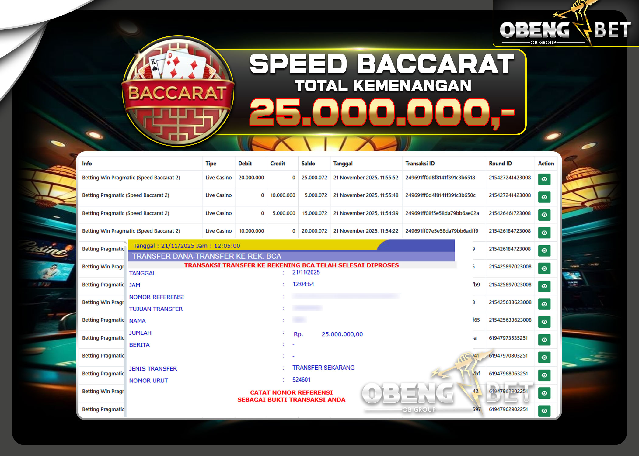 Bukti Kemenangan Member OBENGBET Live Casino 21 Nov 2025 – Situs kami merupakan salah satu situs bandar online terbesar dan terpercaya yang akan selalu membayar berapapun kemenangan pemain di obeng bet. Jika anda belum sempat bermain di situs obengbet kami sangat merekomendasikan link situs ini untuk di jadikan wadah tempat bermain game judi online terbesar dan terpercaya dengan berbagai permain yang sangat populer seperti togel online, slot online, live casino, sportbook, sabung ayam dan banyak permainan lainnya yang sudah di sediakan situs obengbet,