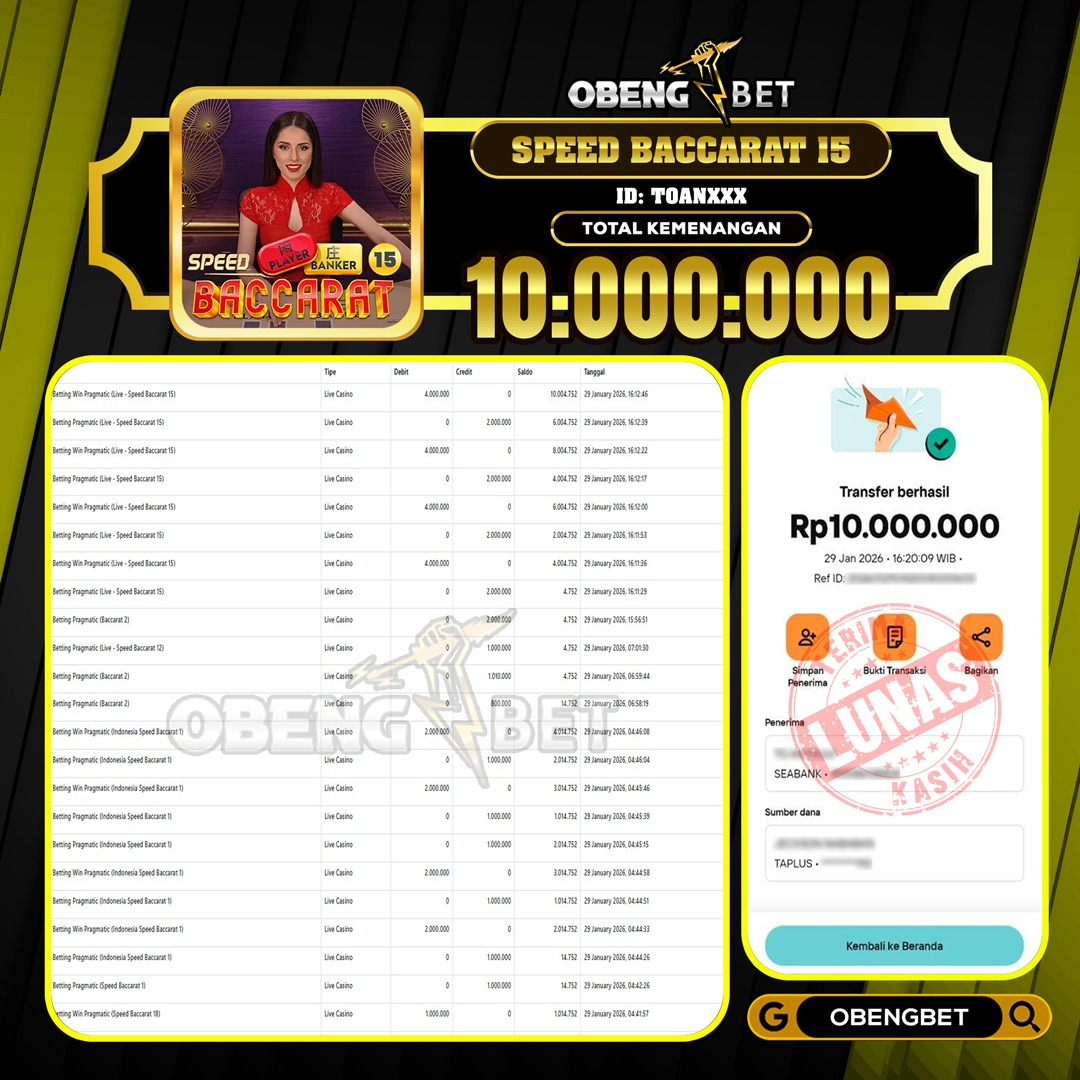 Bukti Kemenangan Member OBENGBET Live Casino 29 Jan 2026 – Situs kami merupakan salah satu situs bandar online terbesar dan terpercaya yang akan selalu membayar berapapun kemenangan pemain di obeng bet. Jika anda belum sempat bermain di situs obengbet kami sangat merekomendasikan link situs ini untuk di jadikan wadah tempat bermain game judi online terbesar dan terpercaya dengan berbagai permain yang sangat populer seperti togel online, slot online, live casino, sportbook, sabung ayam dan banyak permainan lainnya yang sudah di sediakan situs obengbet,